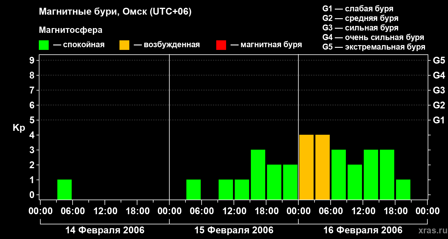 Изменения геомагнитного индекса Kp с 14 по 16 февраля 2006 года для средних широт