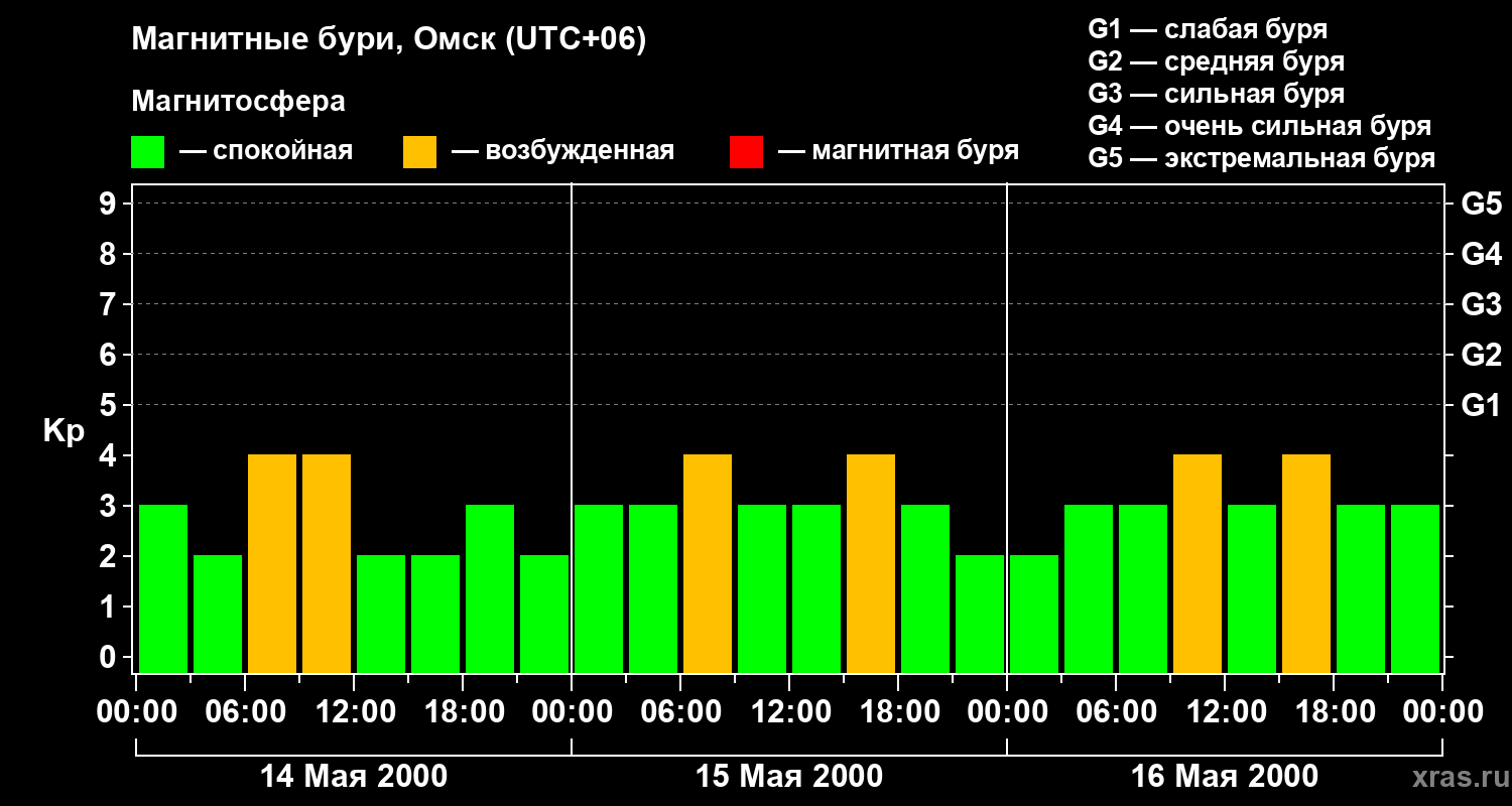 Изменения геомагнитного индекса Kp с 14 по 16 мая 2000 года для средних широт