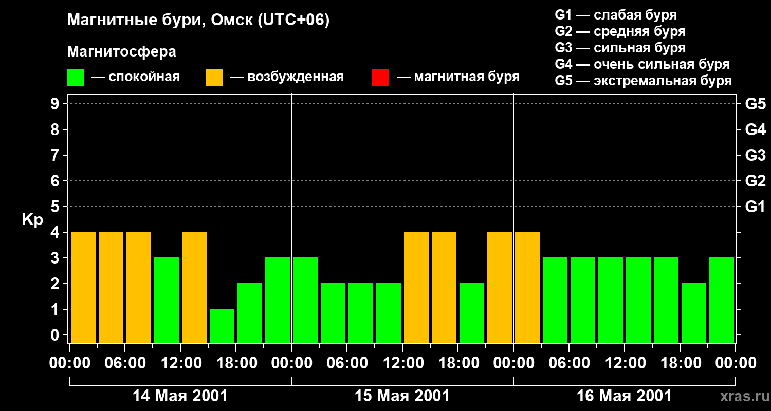 Изменения геомагнитного индекса Kp с 14 по 16 мая 2001 года для средних широт