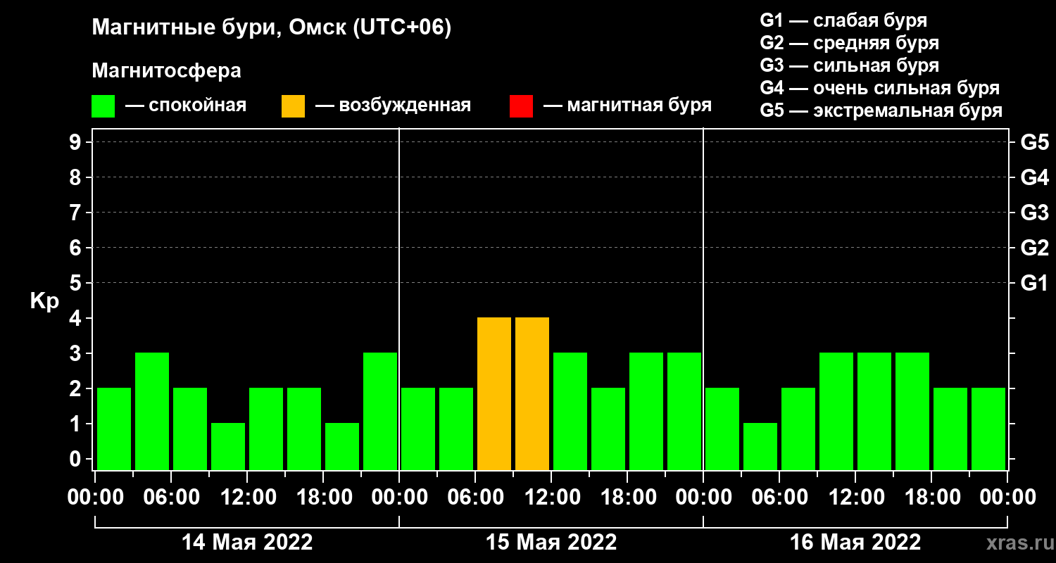 Изменения геомагнитного индекса Kp с 14 по 16 мая 2022 года для средних широт