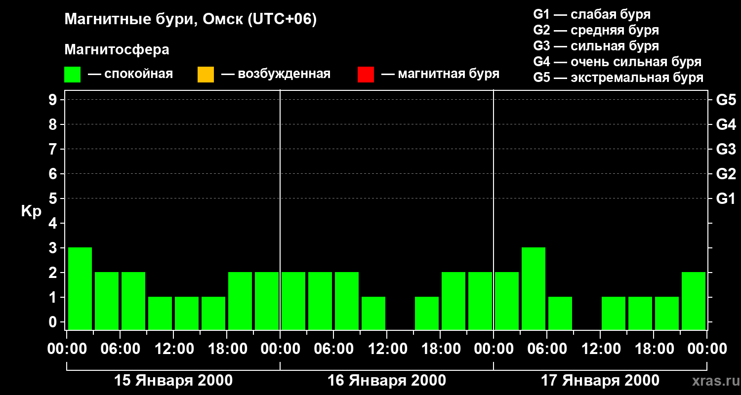 Изменения геомагнитного индекса Kp с 15 по 17 января 2000 года для средних широт