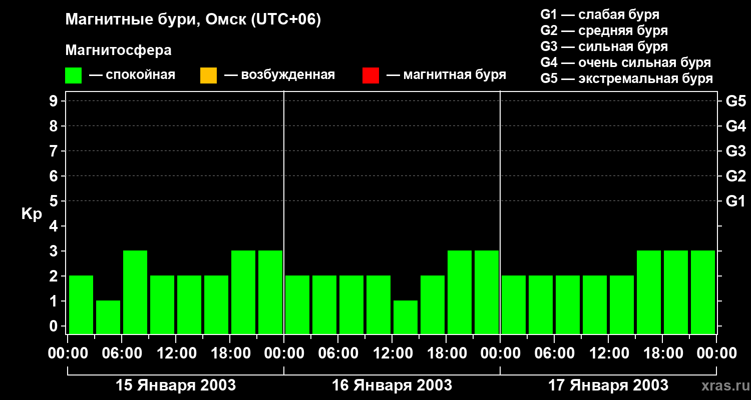 Изменения геомагнитного индекса Kp с 15 по 17 января 2003 года для средних широт