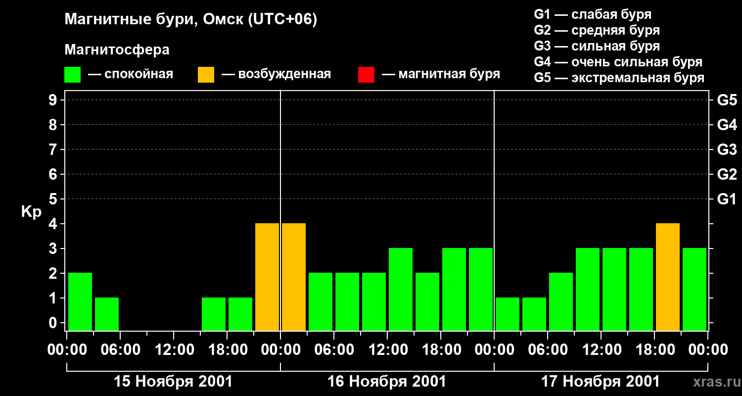 Изменения геомагнитного индекса Kp с 15 по 17 ноября 2001 года для средних широт