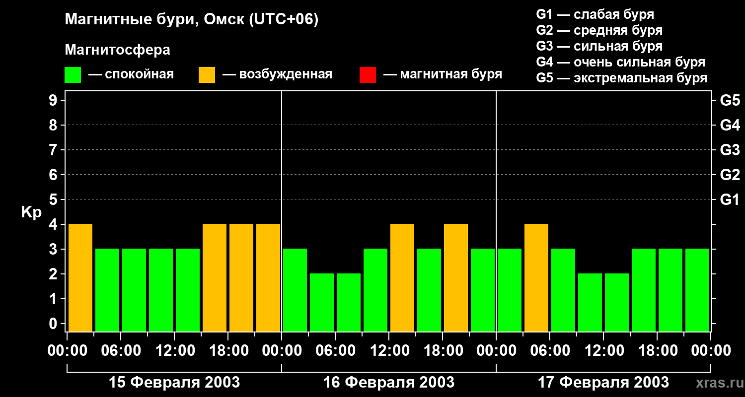 Изменения геомагнитного индекса Kp с 15 по 17 февраля 2003 года для средних широт
