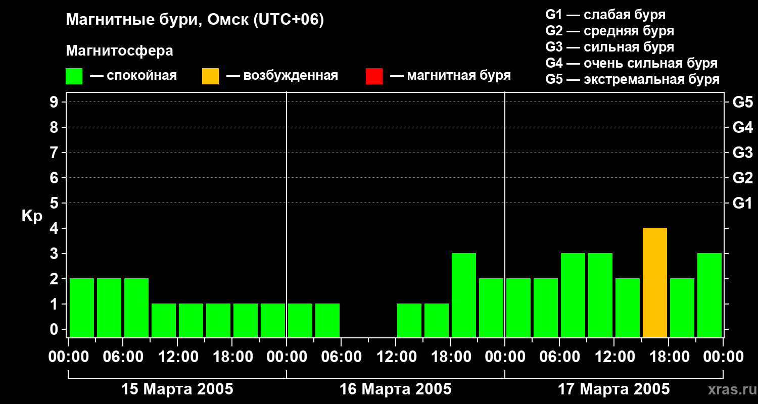 Изменения геомагнитного индекса Kp с 15 по 17 марта 2005 года для средних широт