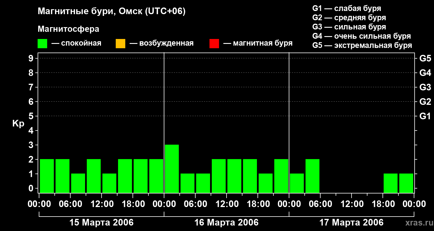 Изменения геомагнитного индекса Kp с 15 по 17 марта 2006 года для средних широт