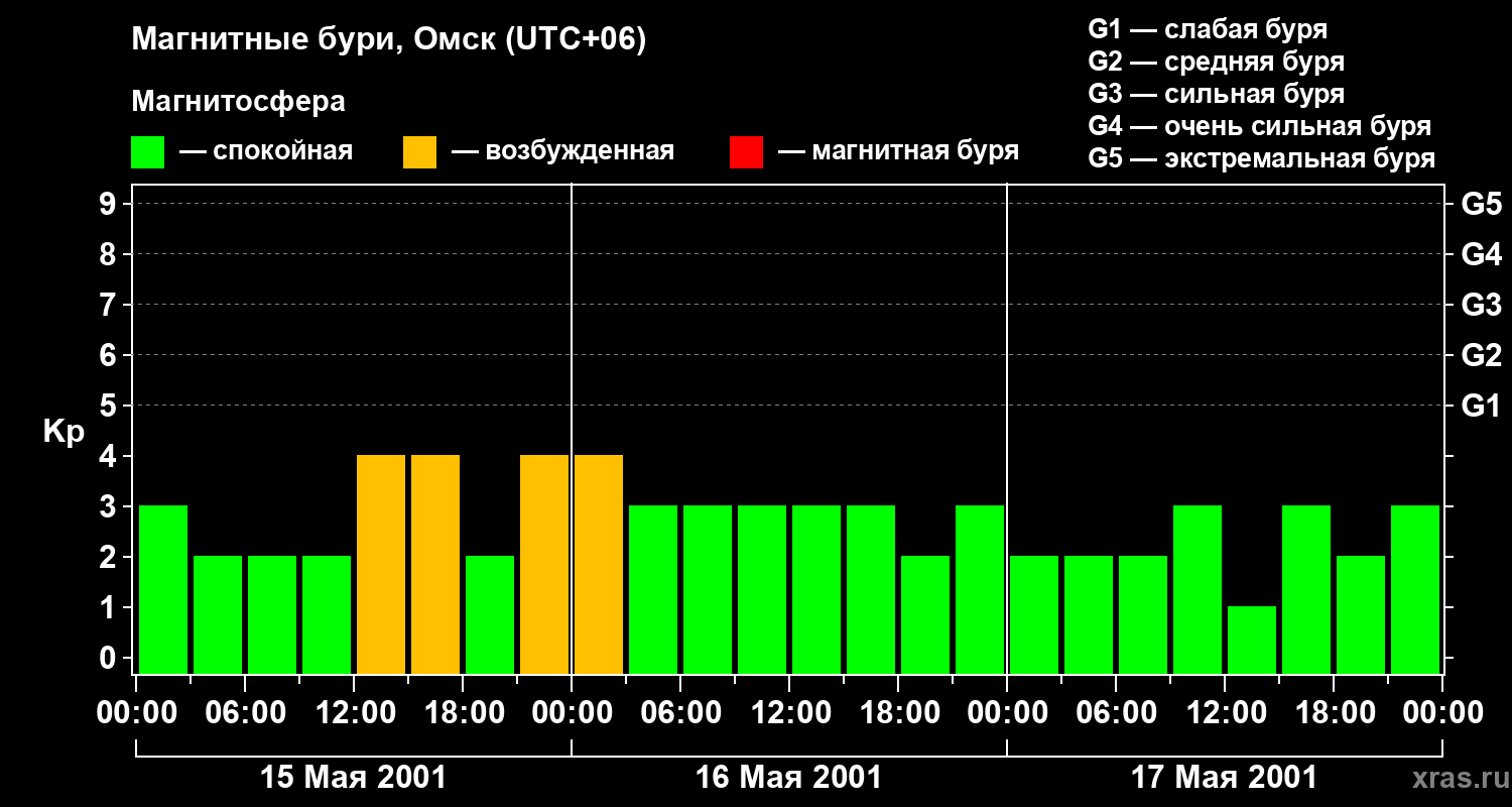 Изменения геомагнитного индекса Kp с 15 по 17 мая 2001 года для средних широт