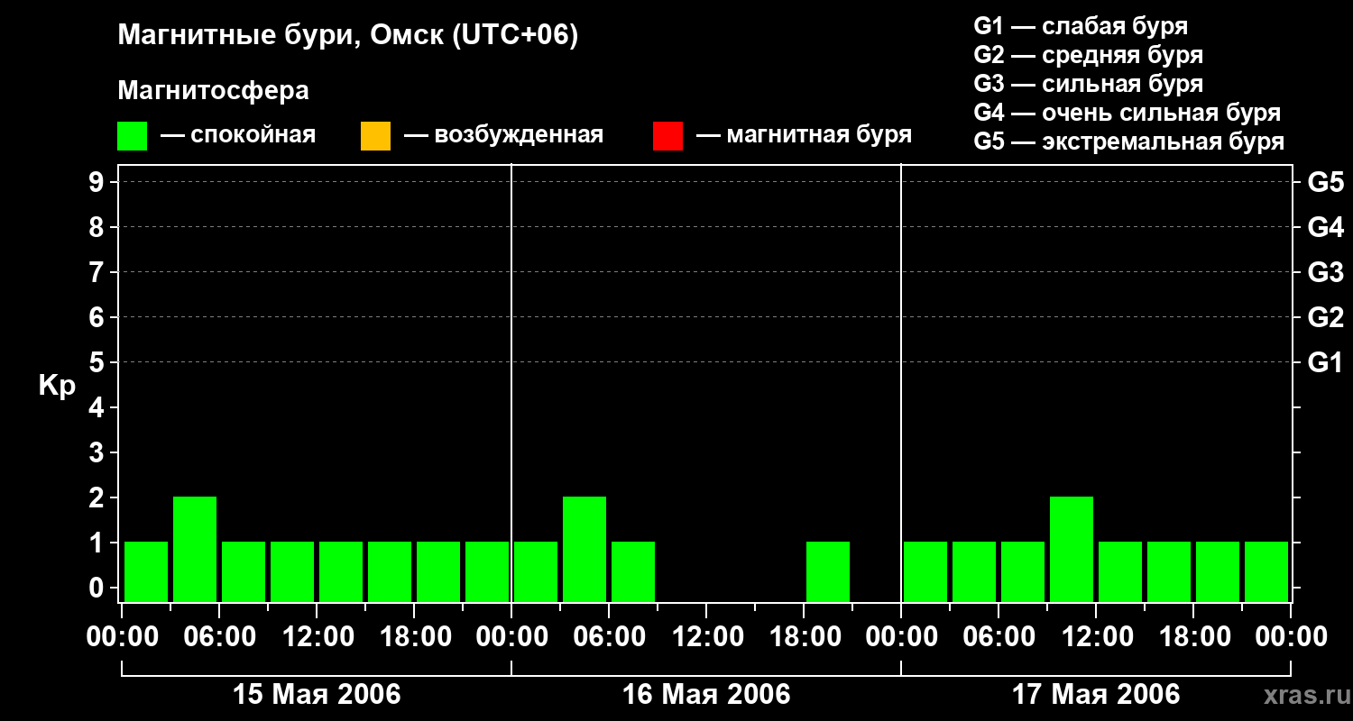 Изменения геомагнитного индекса Kp с 15 по 17 мая 2006 года для средних широт
