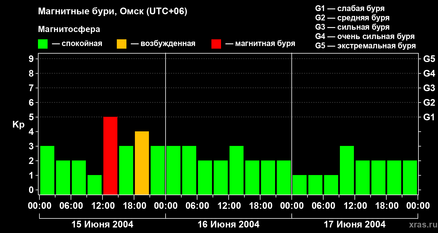 Изменения геомагнитного индекса Kp с 15 по 17 июня 2004 года для средних широт