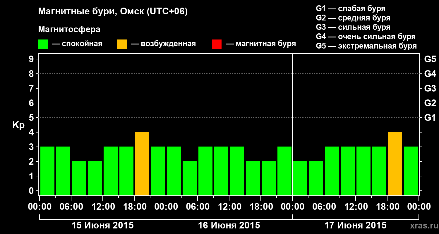 Изменения геомагнитного индекса Kp с 15 по 17 июня 2015 года для средних широт