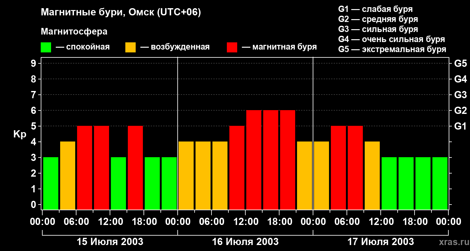 Изменения геомагнитного индекса Kp с 15 по 17 июля 2003 года для средних широт
