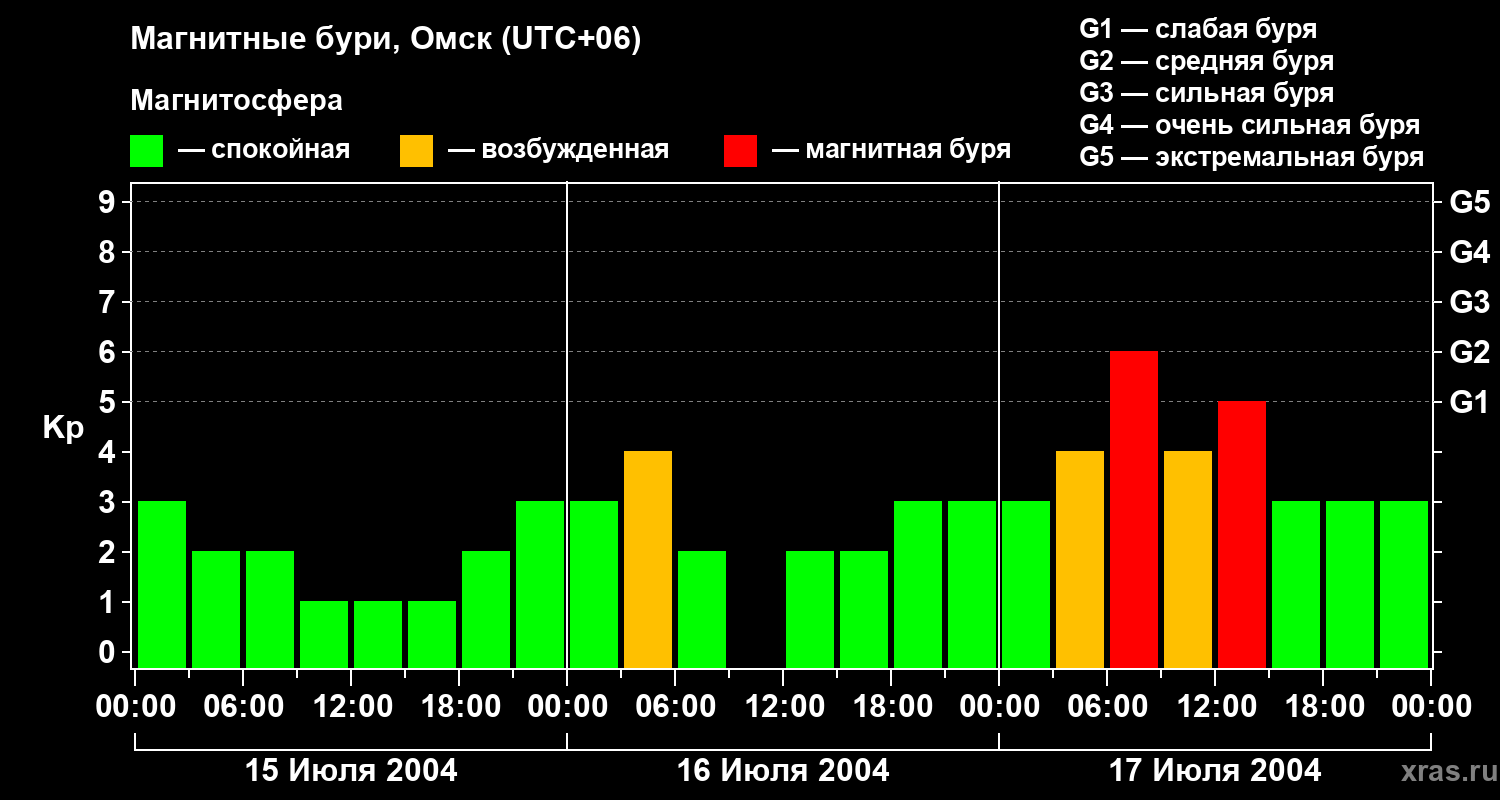 Изменения геомагнитного индекса Kp с 15 по 17 июля 2004 года для средних широт