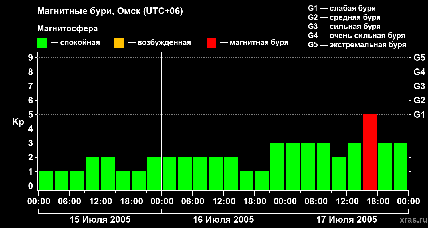 Изменения геомагнитного индекса Kp с 15 по 17 июля 2005 года для средних широт