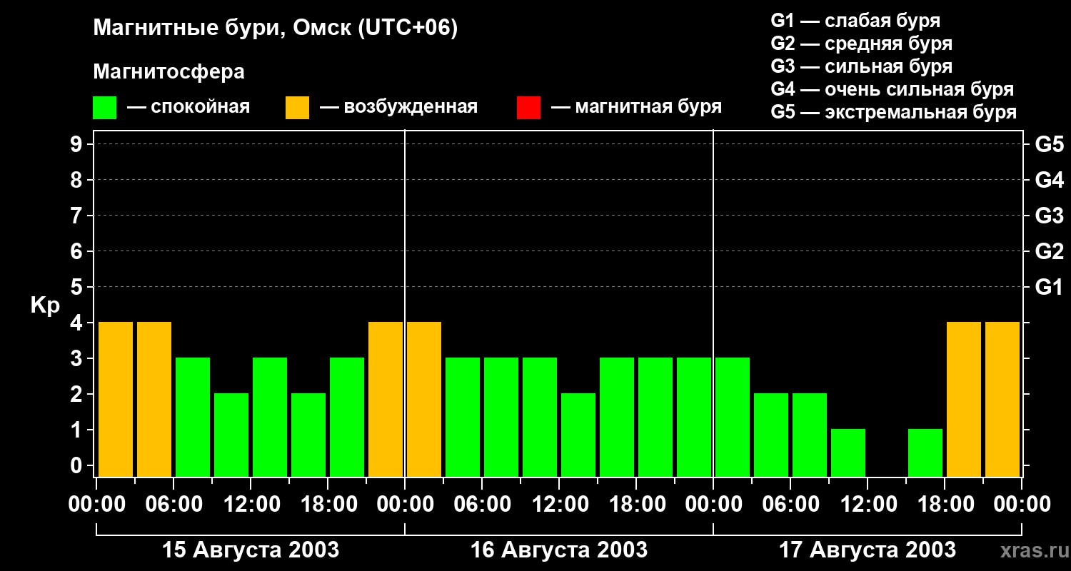 Изменения геомагнитного индекса Kp с 15 по 17 августа 2003 года для средних широт