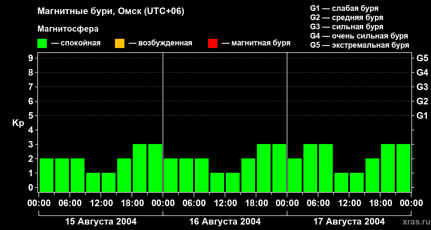 Изменения геомагнитного индекса Kp с 15 по 17 августа 2004 года для средних широт