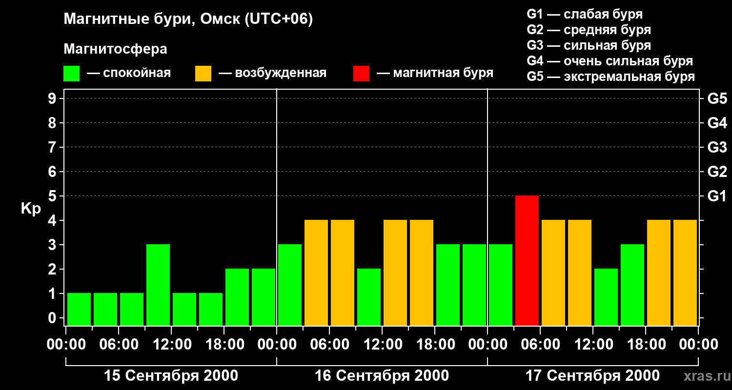 Изменения геомагнитного индекса Kp с 15 по 17 сентября 2000 года для средних широт