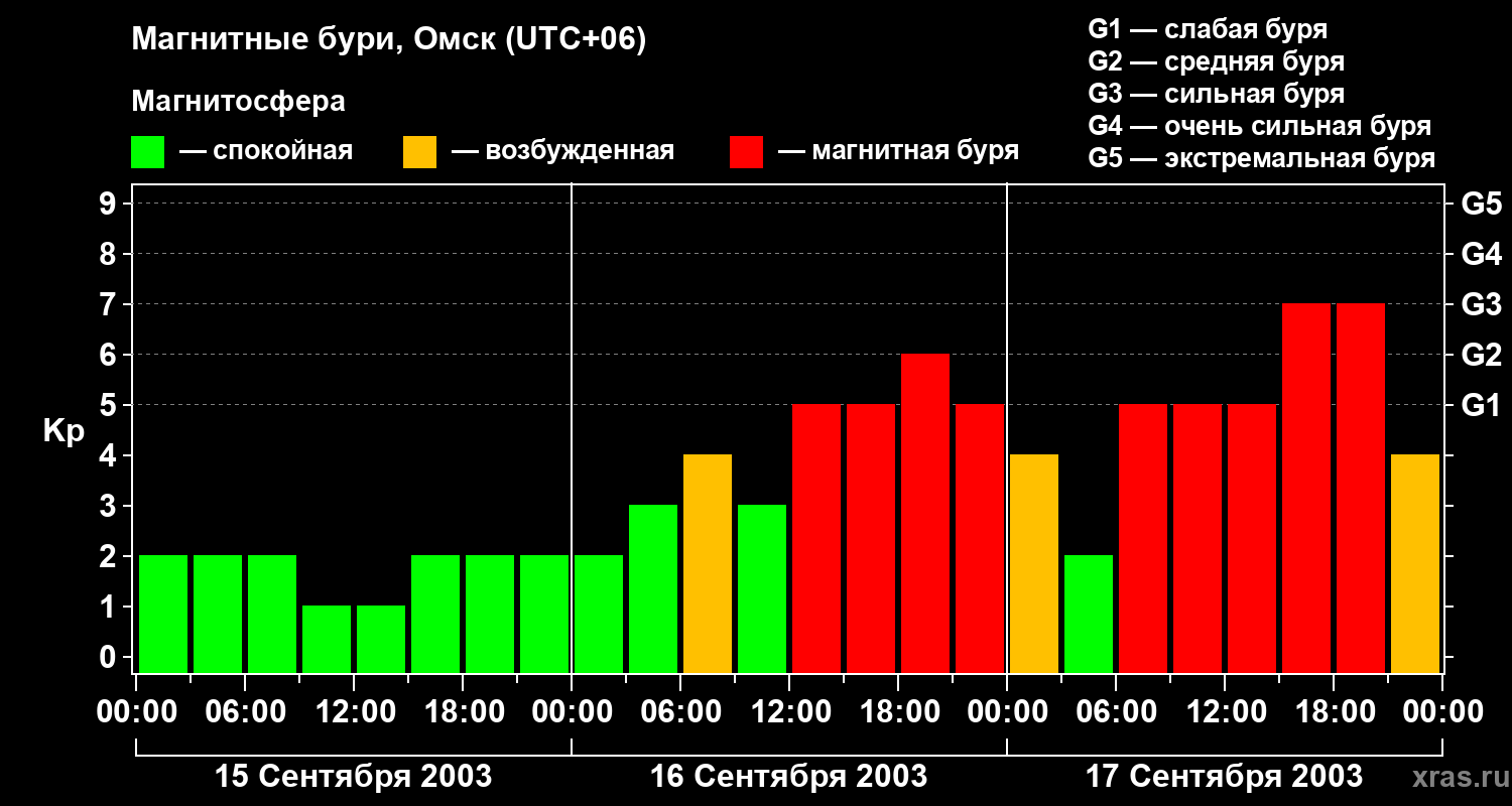 Изменения геомагнитного индекса Kp с 15 по 17 сентября 2003 года для средних широт