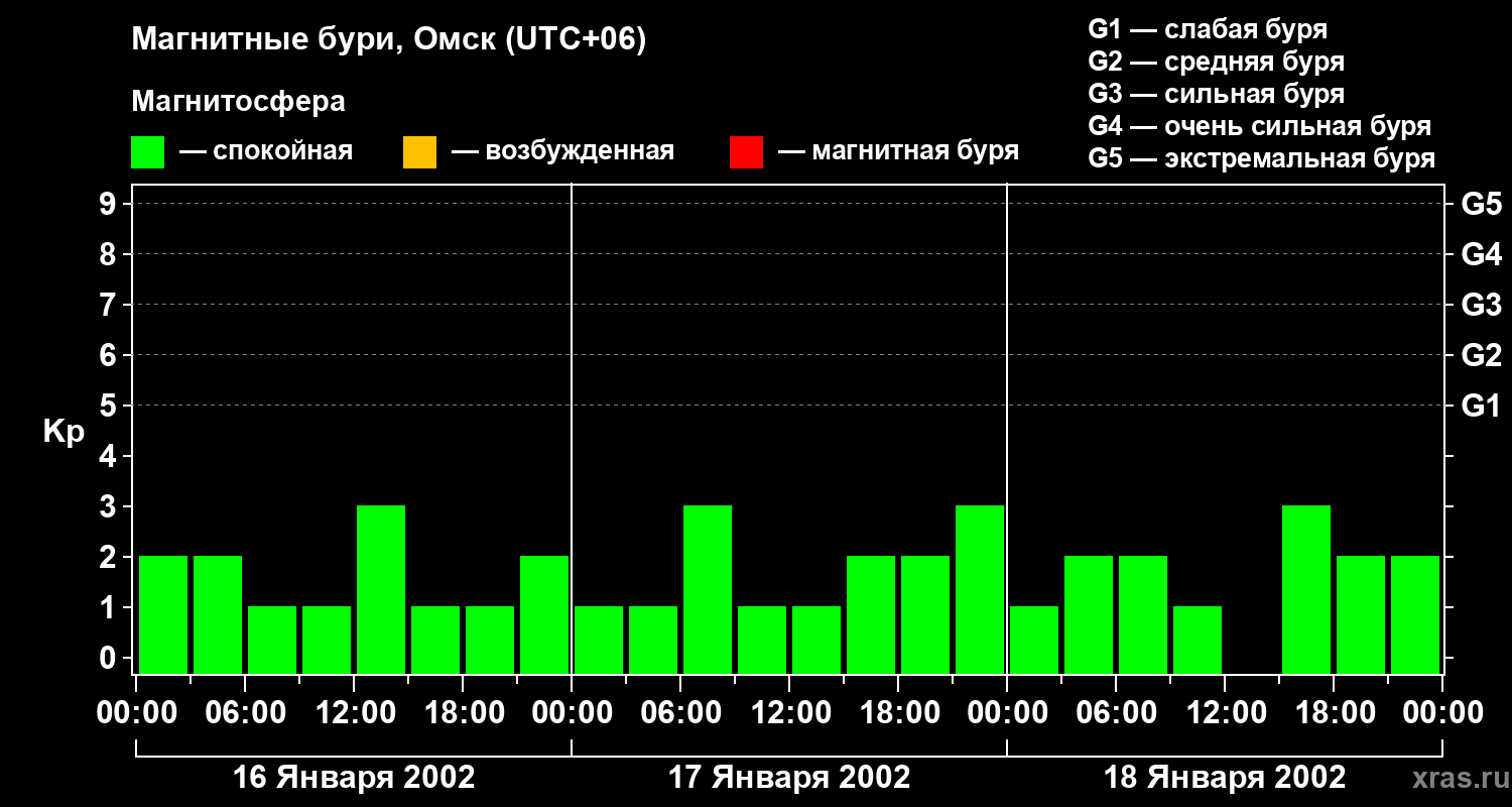 Изменения геомагнитного индекса Kp с 16 по 18 января 2002 года для средних широт