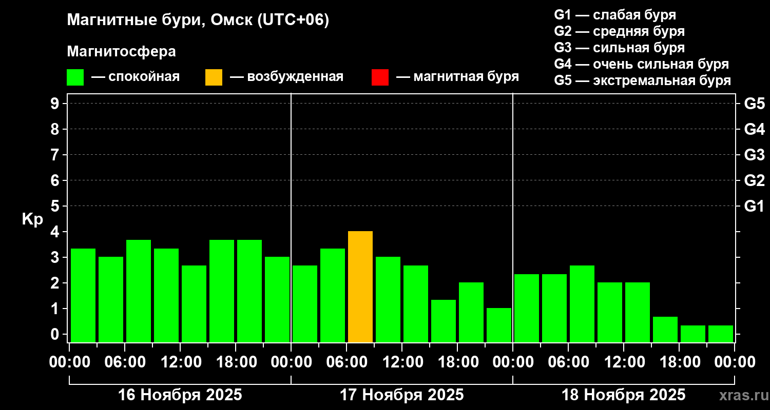 Изменения геомагнитного индекса Kp с 16 по 18 ноября 2025 года для средних широт