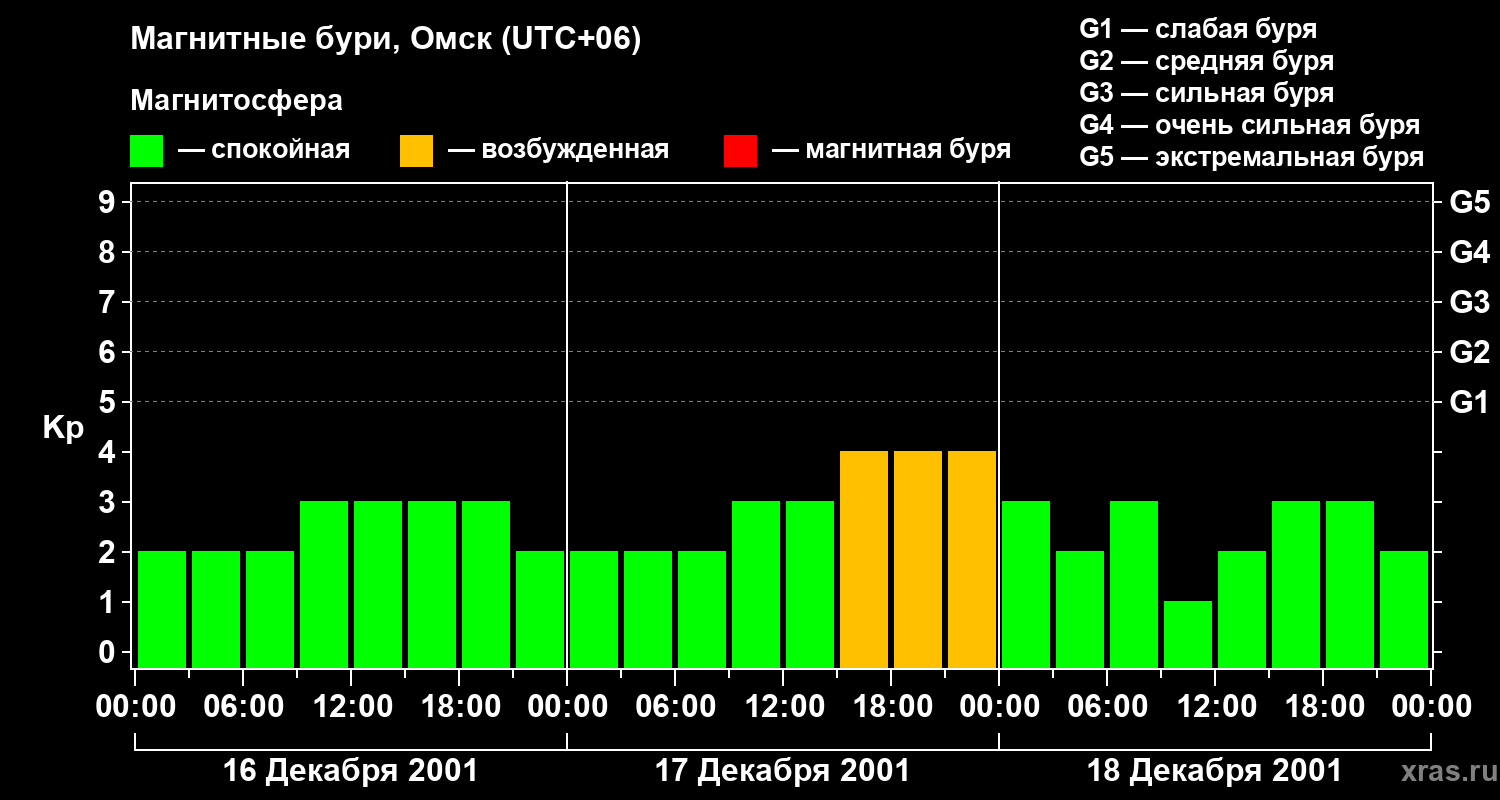 Изменения геомагнитного индекса Kp с 16 по 18 декабря 2001 года для средних широт