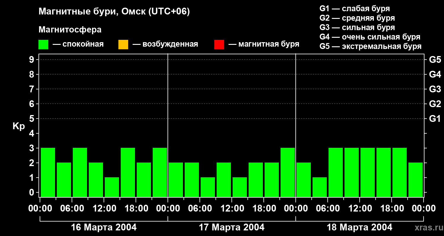 Изменения геомагнитного индекса Kp с 16 по 18 марта 2004 года для средних широт