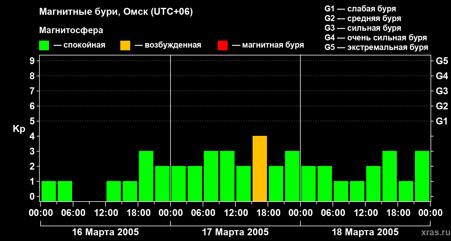 Изменения геомагнитного индекса Kp с 16 по 18 марта 2005 года для средних широт
