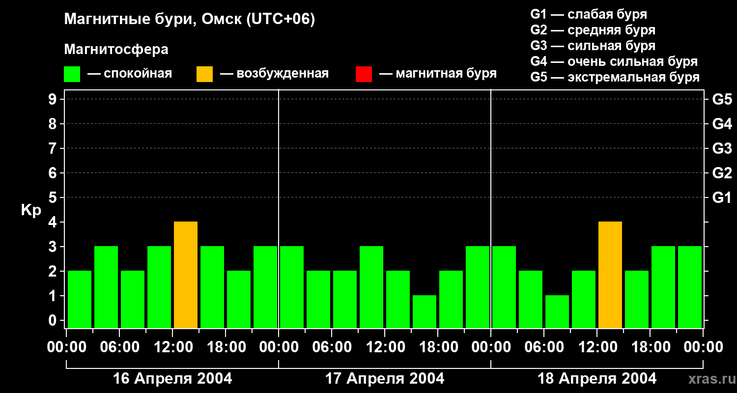 Изменения геомагнитного индекса Kp с 16 по 18 апреля 2004 года для средних широт