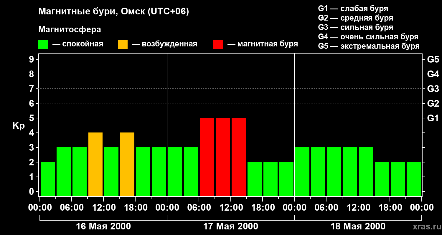 Изменения геомагнитного индекса Kp с 16 по 18 мая 2000 года для средних широт