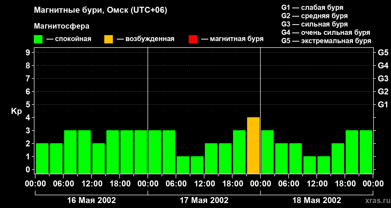 Изменения геомагнитного индекса Kp с 16 по 18 мая 2002 года для средних широт