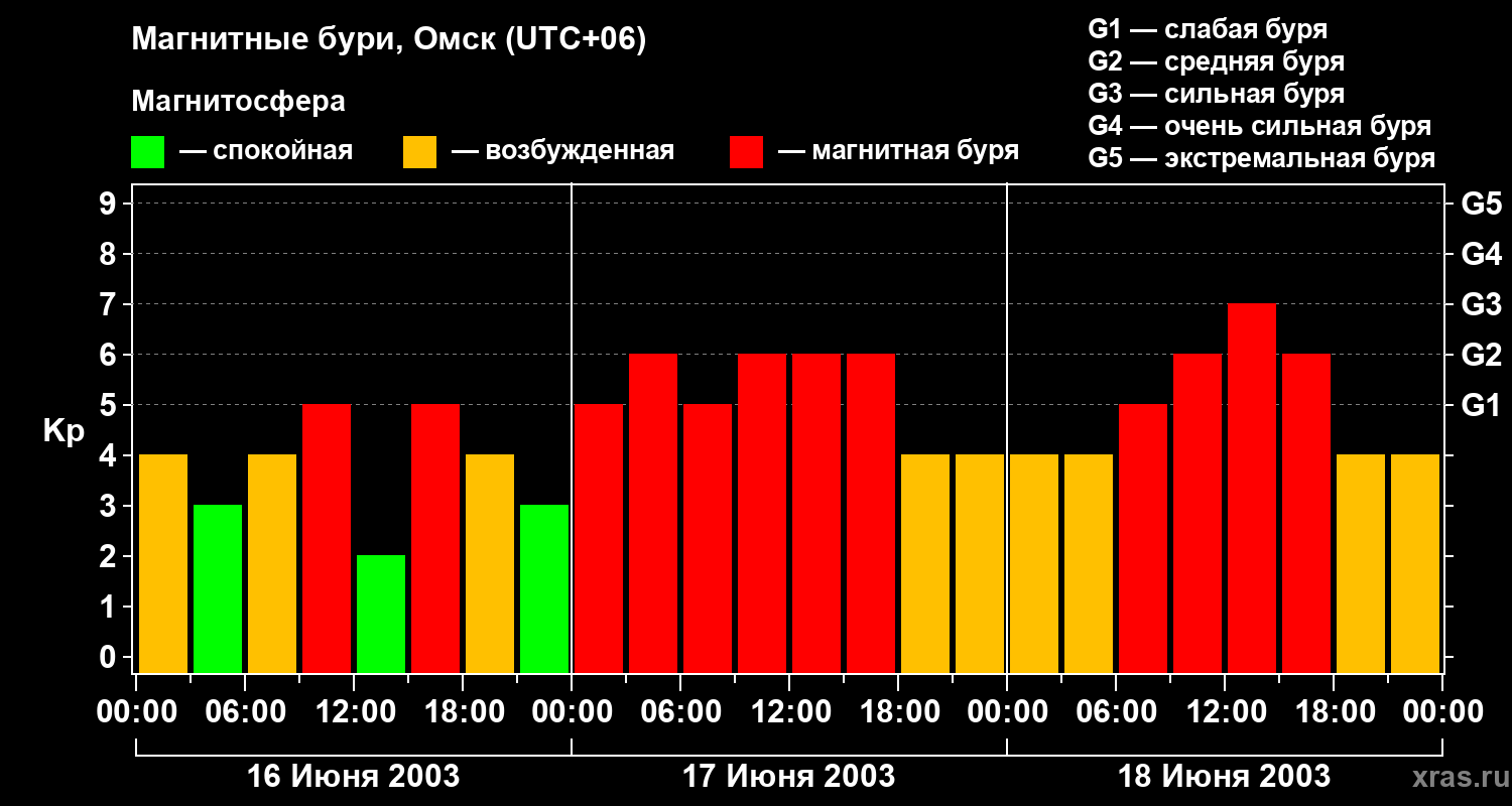Изменения геомагнитного индекса Kp с 16 по 18 июня 2003 года для средних широт