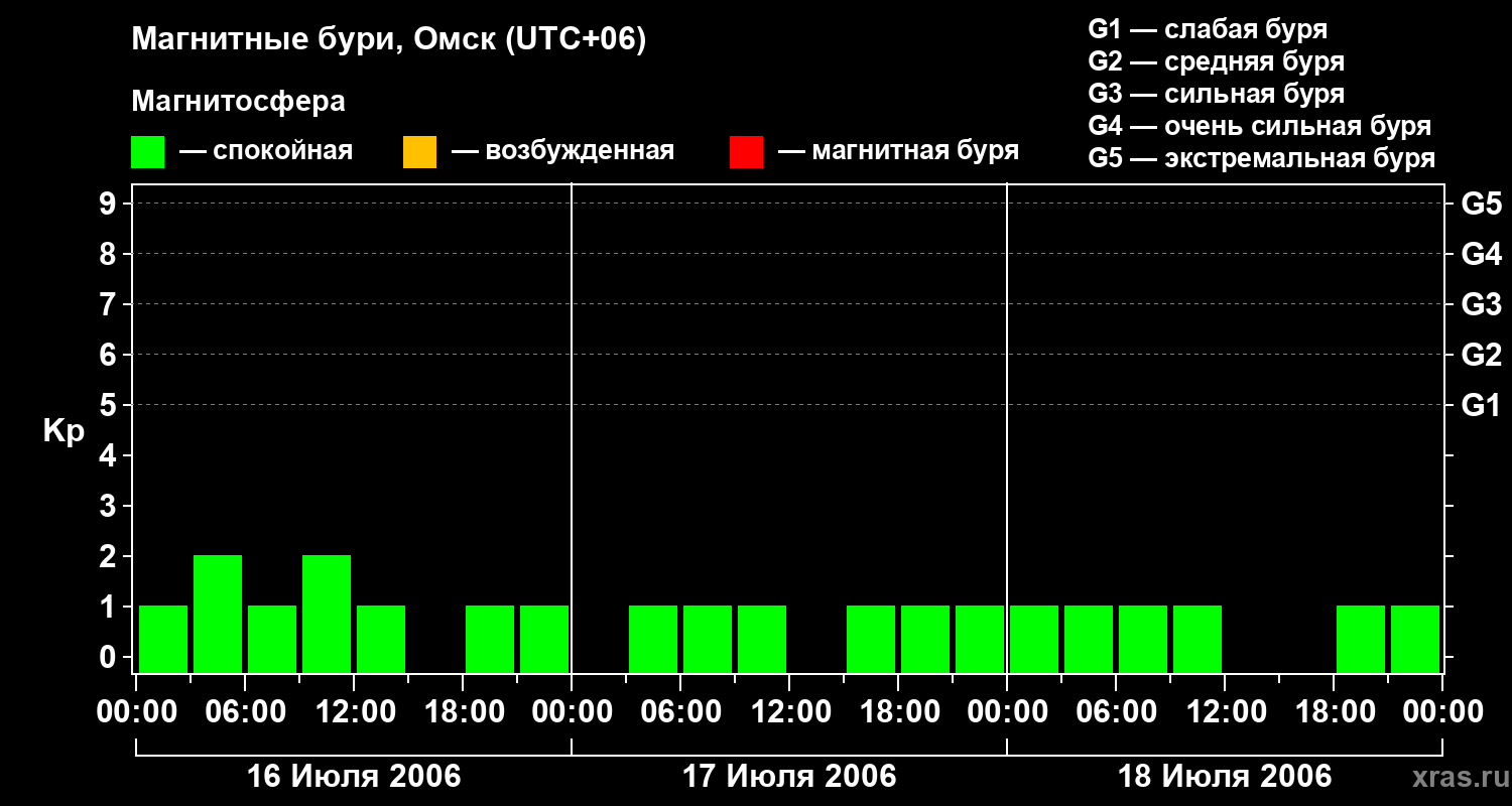 Изменения геомагнитного индекса Kp с 16 по 18 июля 2006 года для средних широт