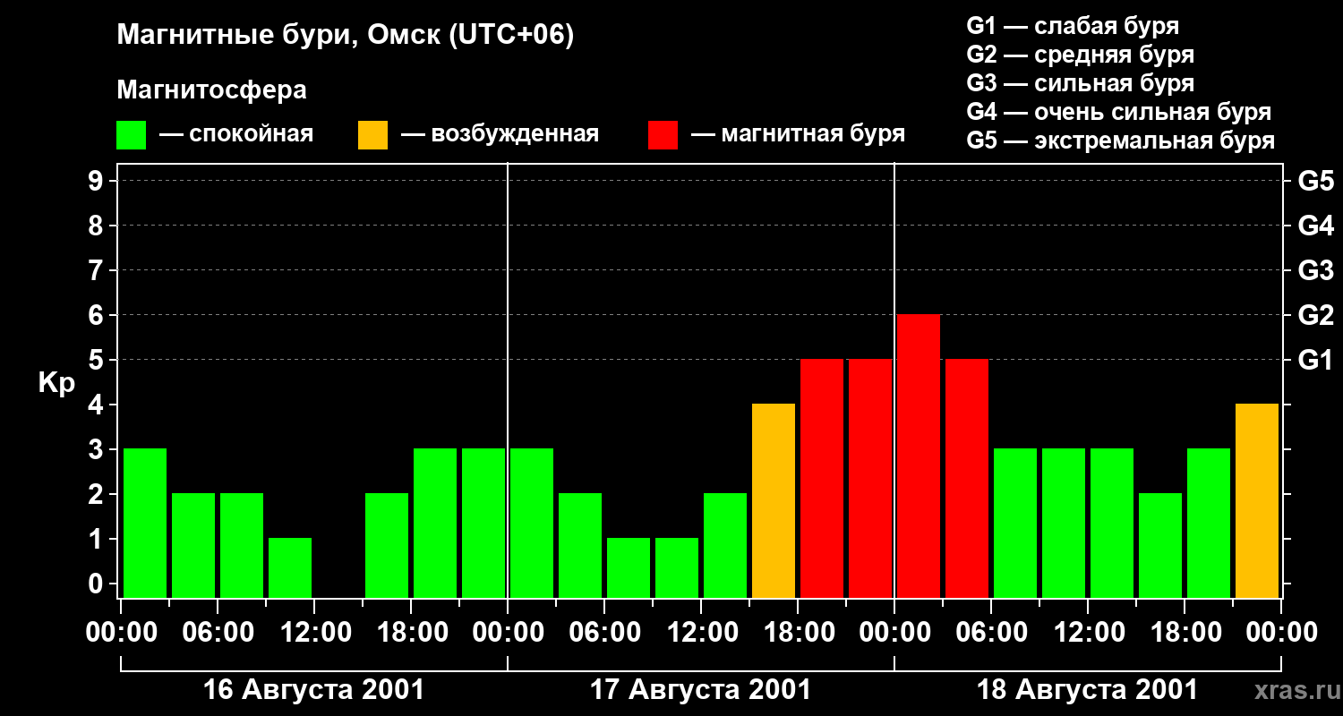 Изменения геомагнитного индекса Kp с 16 по 18 августа 2001 года для средних широт