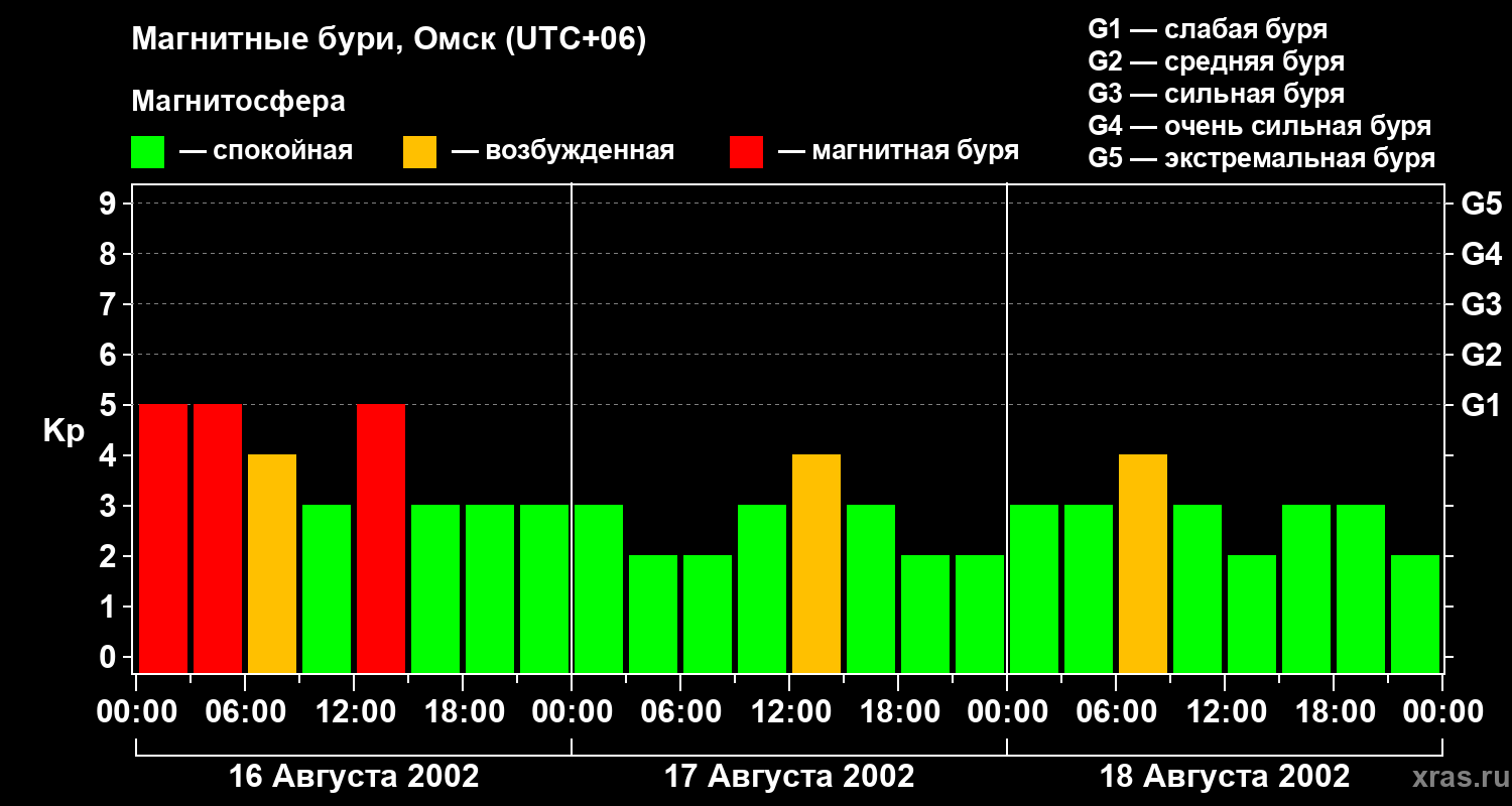 Изменения геомагнитного индекса Kp с 16 по 18 августа 2002 года для средних широт