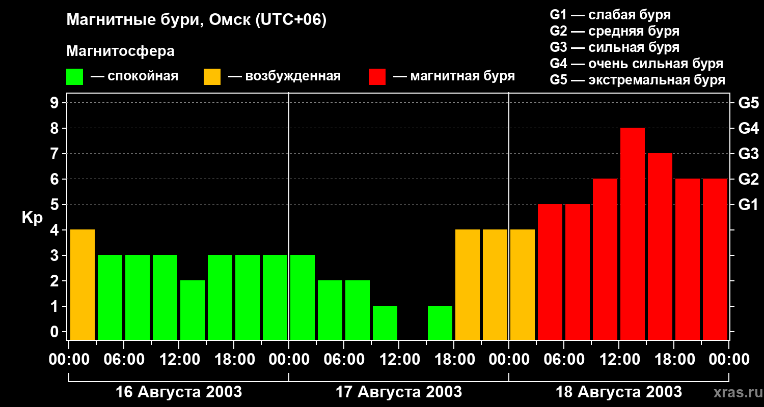 Изменения геомагнитного индекса Kp с 16 по 18 августа 2003 года для средних широт