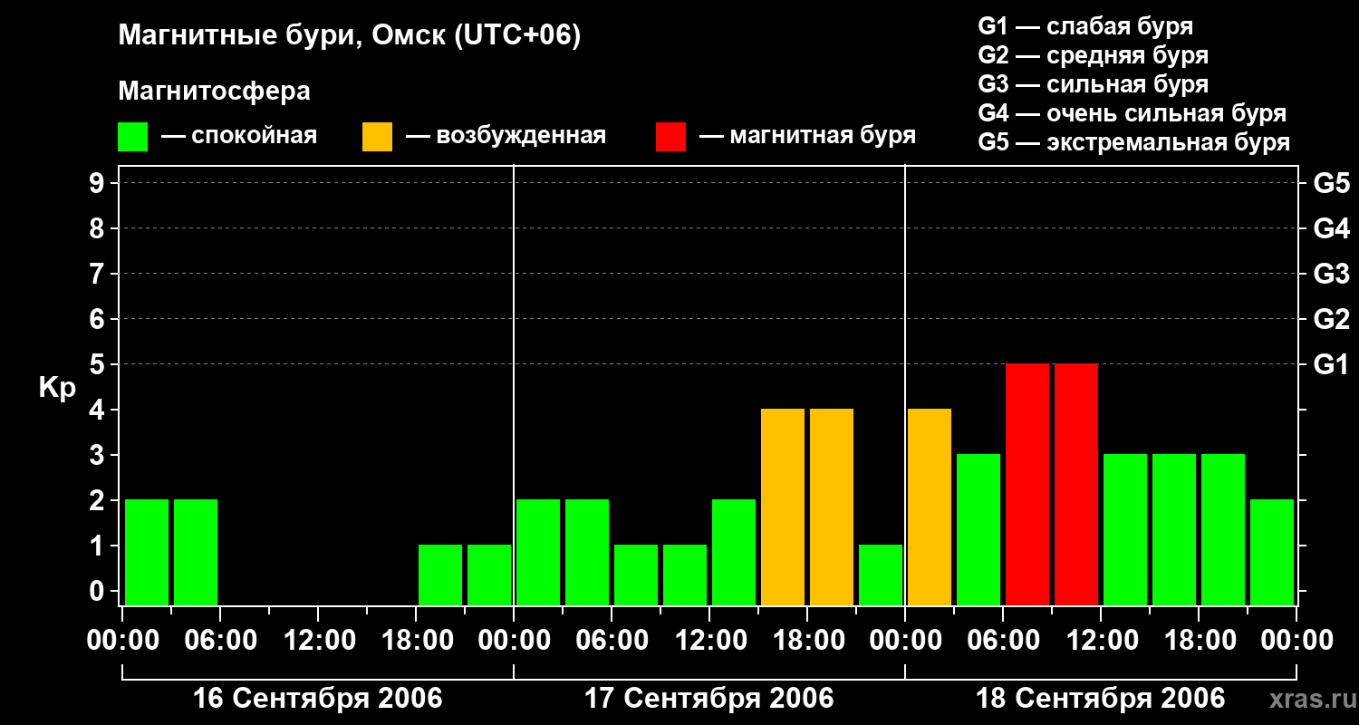 Изменения геомагнитного индекса Kp с 16 по 18 сентября 2006 года для средних широт