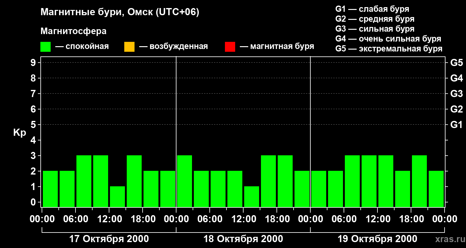 Изменения геомагнитного индекса Kp с 17 по 19 октября 2000 года для средних широт