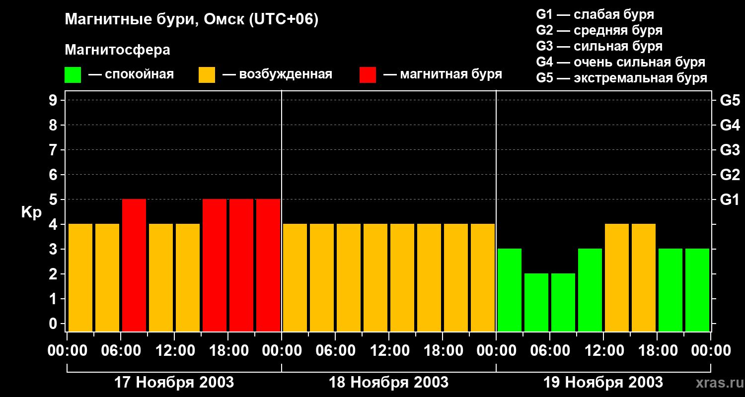 Изменения геомагнитного индекса Kp с 17 по 19 ноября 2003 года для средних широт