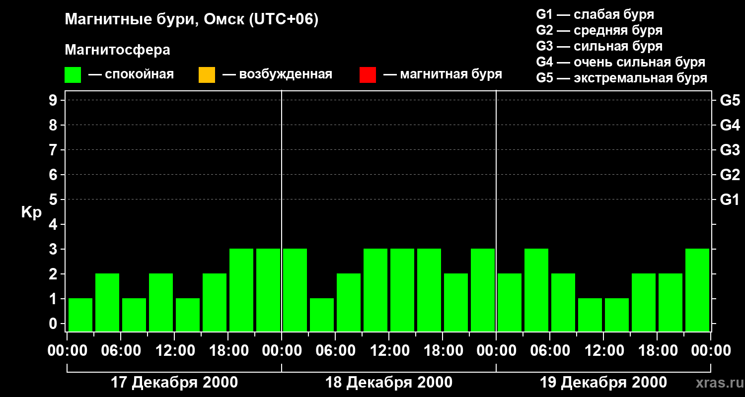 Изменения геомагнитного индекса Kp с 17 по 19 декабря 2000 года для средних широт