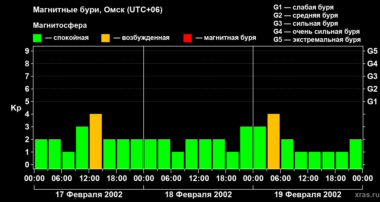 Изменения геомагнитного индекса Kp с 17 по 19 февраля 2002 года для средних широт