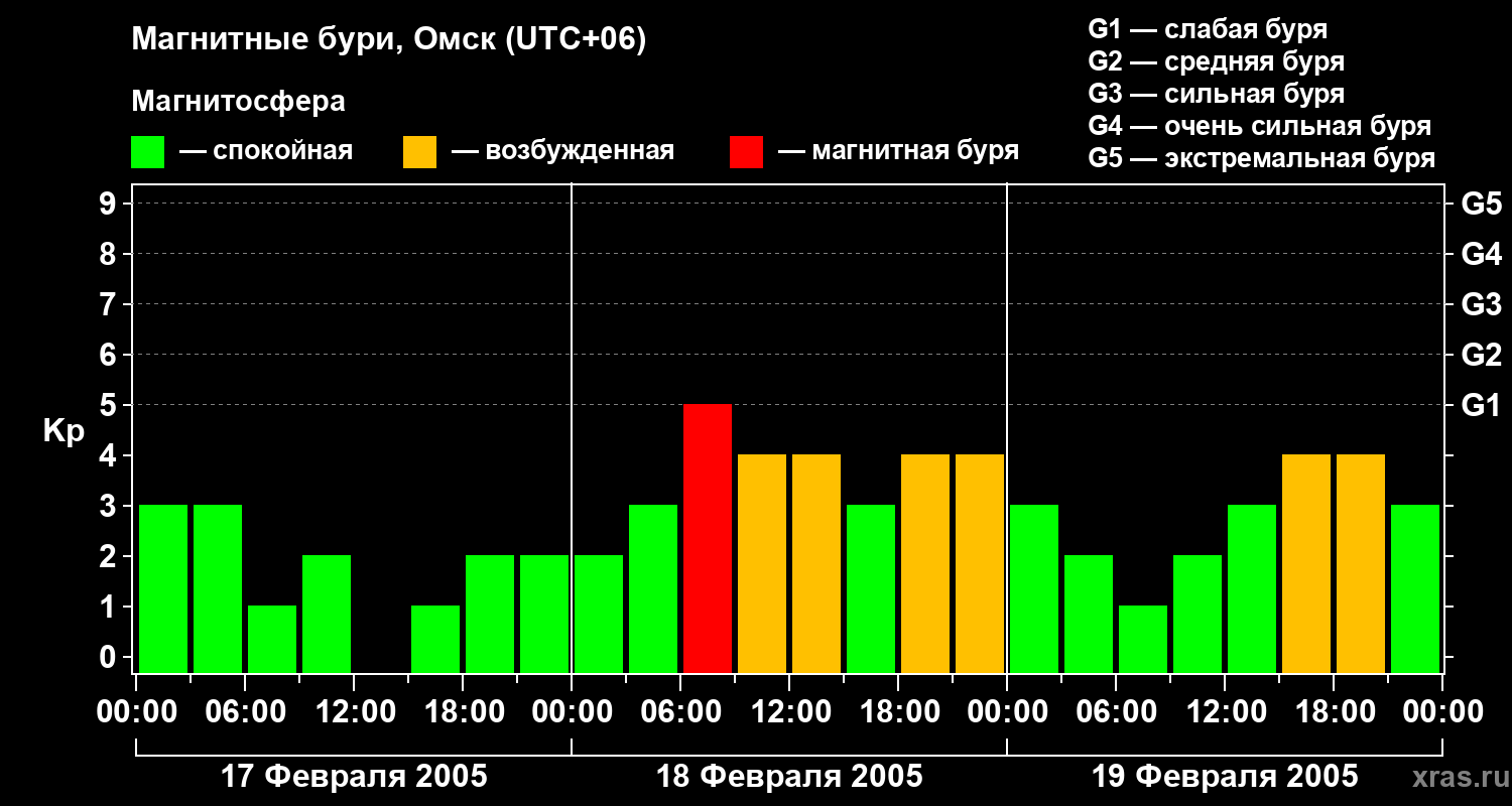 Изменения геомагнитного индекса Kp с 17 по 19 февраля 2005 года для средних широт