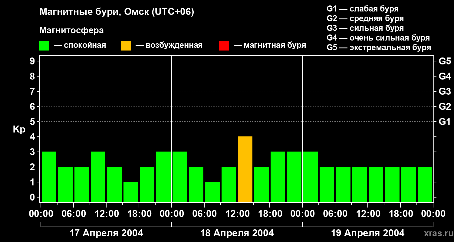Изменения геомагнитного индекса Kp с 17 по 19 апреля 2004 года для средних широт