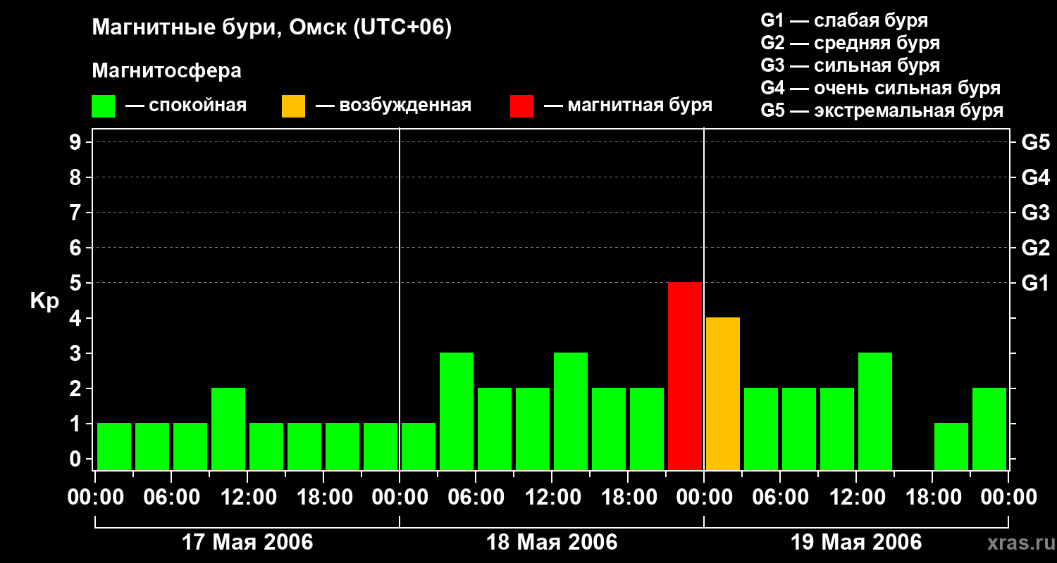 Изменения геомагнитного индекса Kp с 17 по 19 мая 2006 года для средних широт
