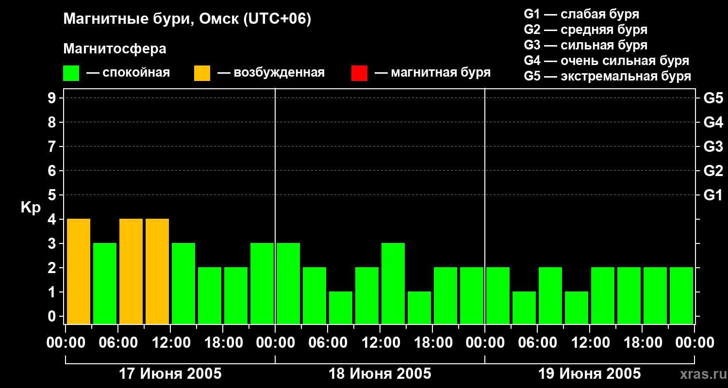 Изменения геомагнитного индекса Kp с 17 по 19 июня 2005 года для средних широт
