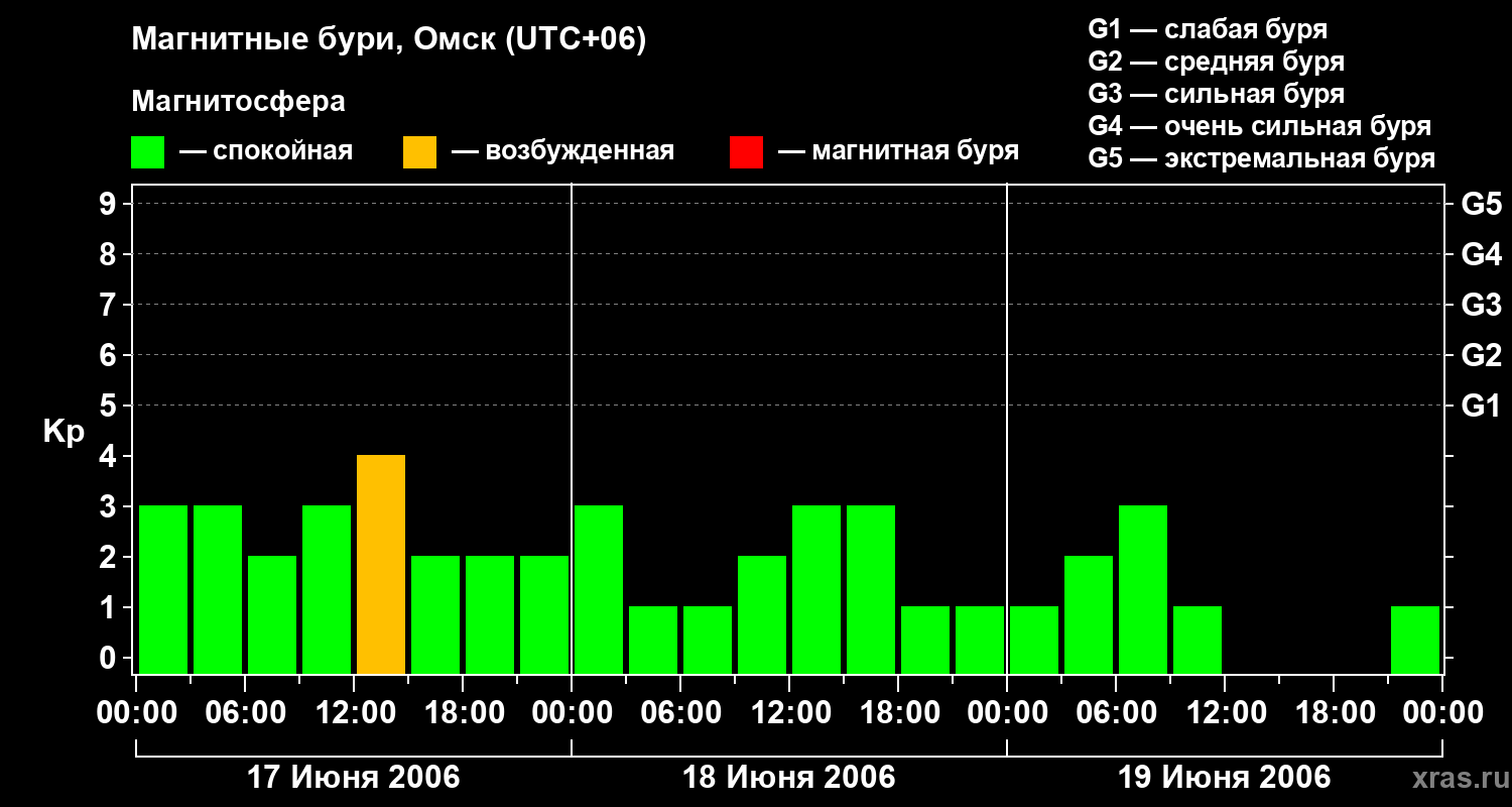 Изменения геомагнитного индекса Kp с 17 по 19 июня 2006 года для средних широт