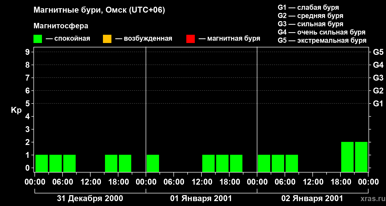 Изменения геомагнитного индекса Kp с 31 декабря 2000 года по 2 января 2001 года для средних широт