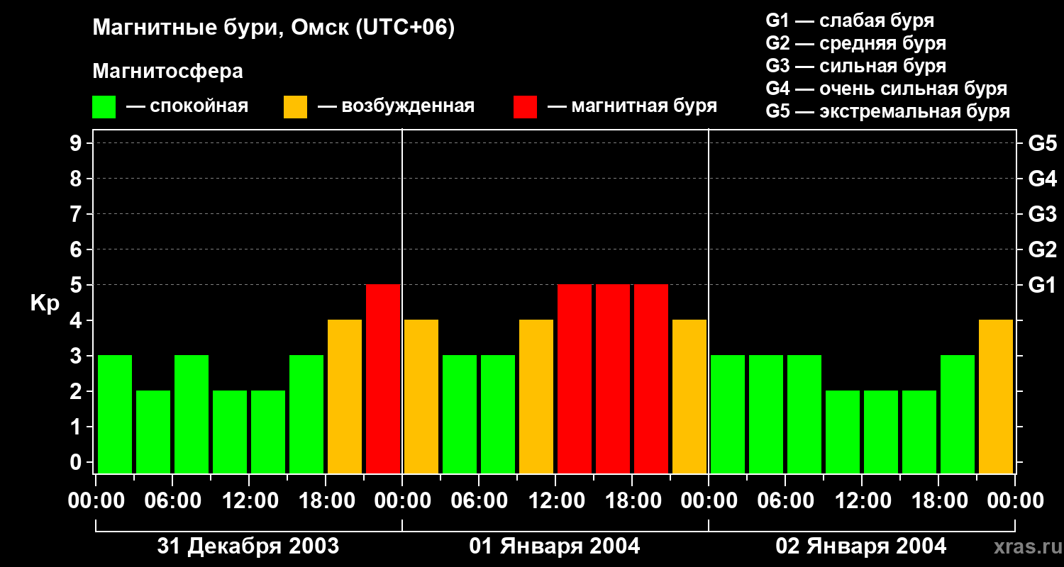 Изменения геомагнитного индекса Kp с 31 декабря 2003 года по 2 января 2004 года для средних широт
