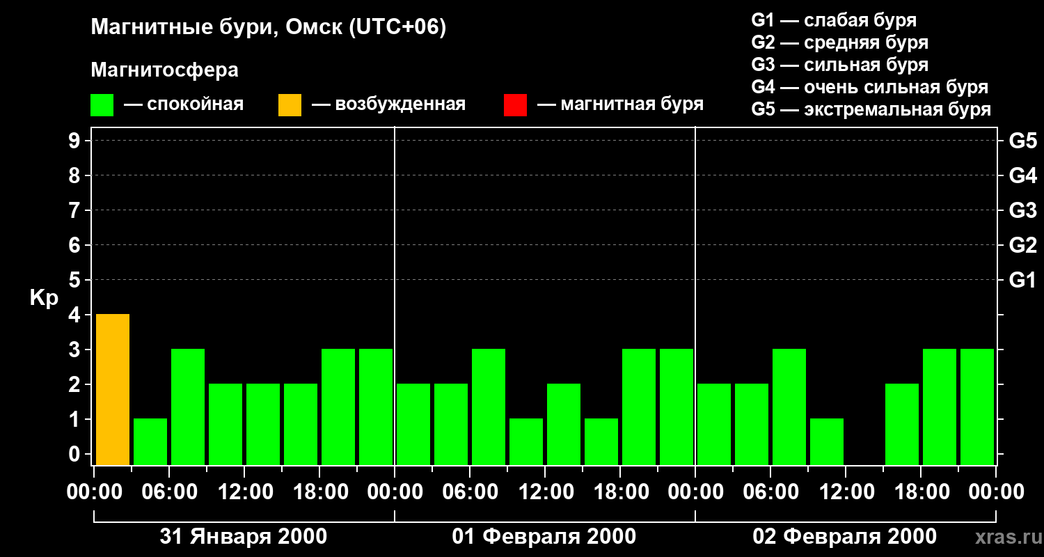 Изменения геомагнитного индекса Kp с 31 января по 2 февраля 2000 года для средних широт