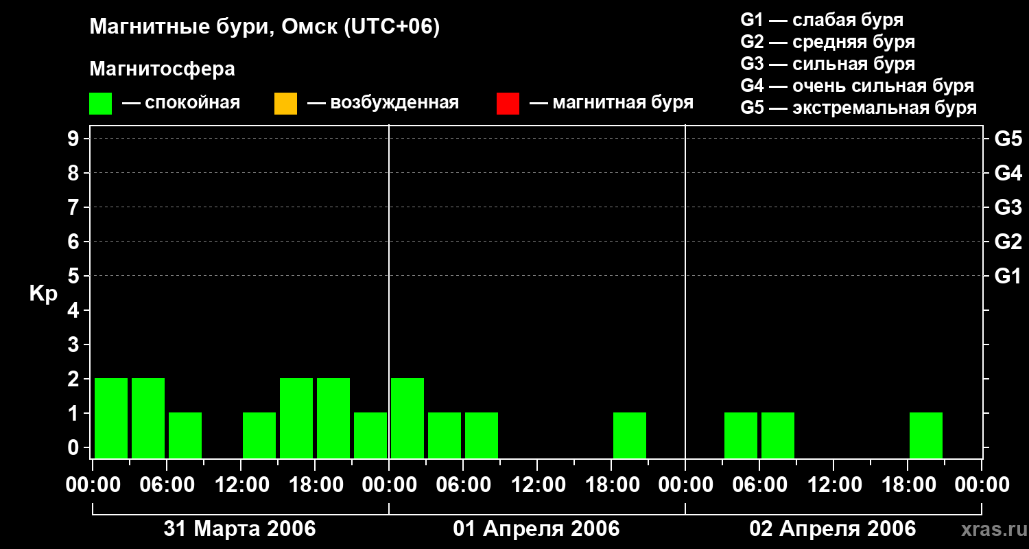 Изменения геомагнитного индекса Kp с 31 марта по 2 апреля 2006 года для средних широт