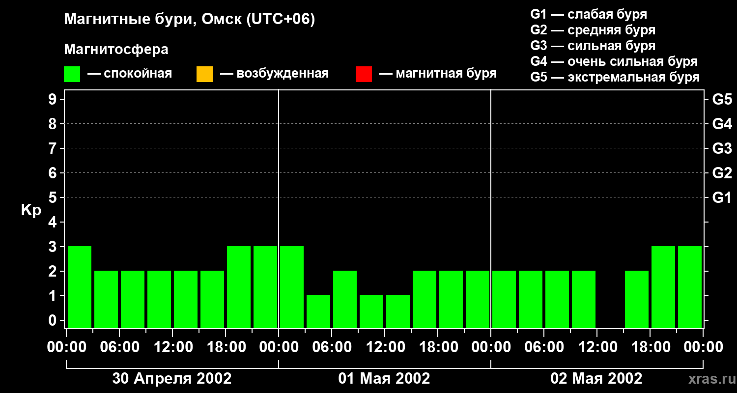 Изменения геомагнитного индекса Kp с 30 апреля по 2 мая 2002 года для средних широт