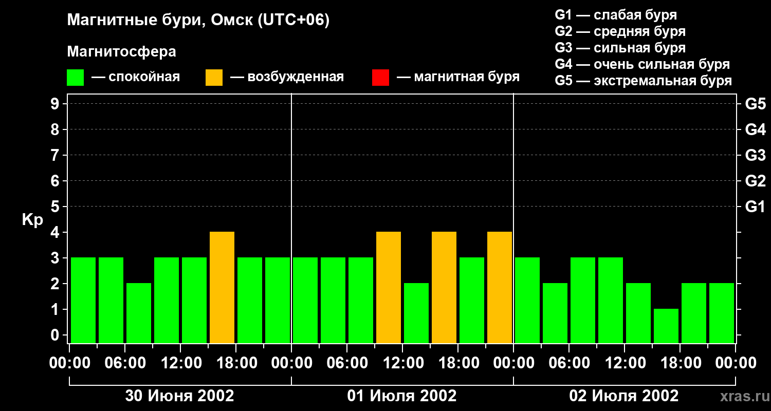 Изменения геомагнитного индекса Kp с 30 июня по 2 июля 2002 года для средних широт